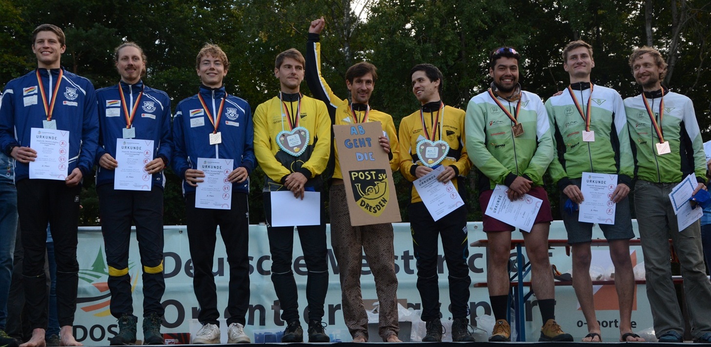 Bei den Herren konnte der MTV sein derzeit bestes Trio an den Start schicken, weil Ole Hennseler in diesem Jahr auf die Sprintläufe verzichtet hatte und folglich auch nicht beim Weltcupfinale starten wollte. Startläufer Till Buchberger ging sehr flott an, musste gegen Ende seiner Teilstrecke aber etwas Federn lassen und übergab nach dennoch gutem Lauf als Fünfter mit überschaubarem Rückstand. Bjarne Friedrichs, gerade erst von einem Kongress aus Japan zurückgekehrt, war läuferisch zwar nicht ganz mehr in der Form vergangener Jahre, fühlte sich in dem technisch anspruchsvollen Felsengelände aber sichtlich wohl. Auf den führenden Post SV Dresden verlor er zwar eine weitere Minute, führte sein Team aber, unter anderem am Nachbarverein MTK Bad Harzburg vorbei, auf den dritten Rang in Schlagdistanz zum USV TU Dresden. Deren Schlussläufer hatte Ole Hennseler sehr schnell überholt, bei seinem Angriff auf die Spitze unterliefen ihm aber einige kleine Unsauberheiten, sodass er die führenden Postler, die in dieser Besetzung seit etlichen Jahren den Titel errungen hatten, nicht gefährden konnte. Das MTV-Trio freute sich dennoch über die Silbermedaille.