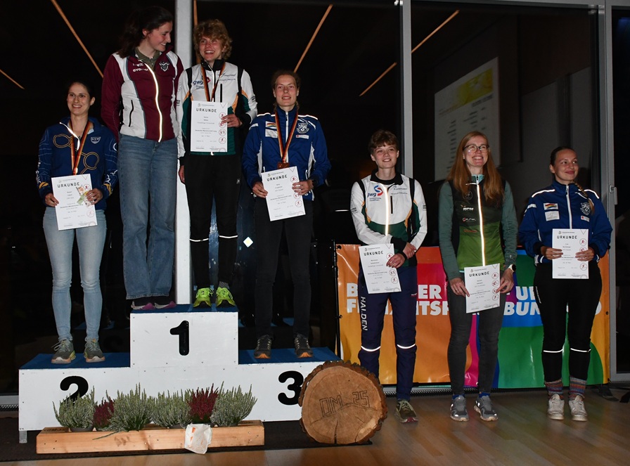 Krankheitsbedingt fehlten Martin und Ole Hennseler, der sich durch seinen Verzicht auf die Sprintwettkämpfe gezielt auf diese Langdistanz vorbereitet hatte. Außerdem war Till Buchberger seiner Nominierung zu seinem letzten Lauf im Nationaldress als Junior gefolgt und in Schottland beim Junioren-Europa-Cup gestartet. So ruhten die MTV-Hoffnungen auf Birte Friedrichs, die auch gleich gut in den Wettkampf hineinfand und bis fast zur Hälfte der Strecke in Führung lag. Dann schwanden allerdings nach der langen Saison, in der Höhepunkt auf Höhepunkt folgte, allmählich die Kräfte und sie musste Hanna Müller und die Altmeisterin Susen Lösch (USV Jena) passieren lassen. Aber auch mit der Bronzemedaille war sie letztendlich zufrieden. Mit einem hervorragenden Lauf schaffte auch Lina Buchberger als starke Sechste den Sprung aufs Podest, sodass die blauen MTV-Jacken gleich zweimal bei der Siegerehrung vertreten waren.